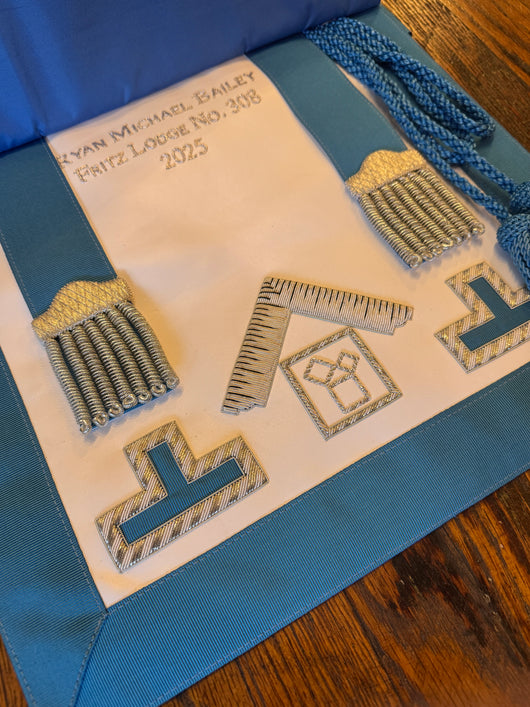 This hand-embroidered Pennsylvania Regulation Past Master's apron features beautiful silver bullion, silver bullion tabs, and light blue tassels. The dimensions are 13" wide by 15" deep.